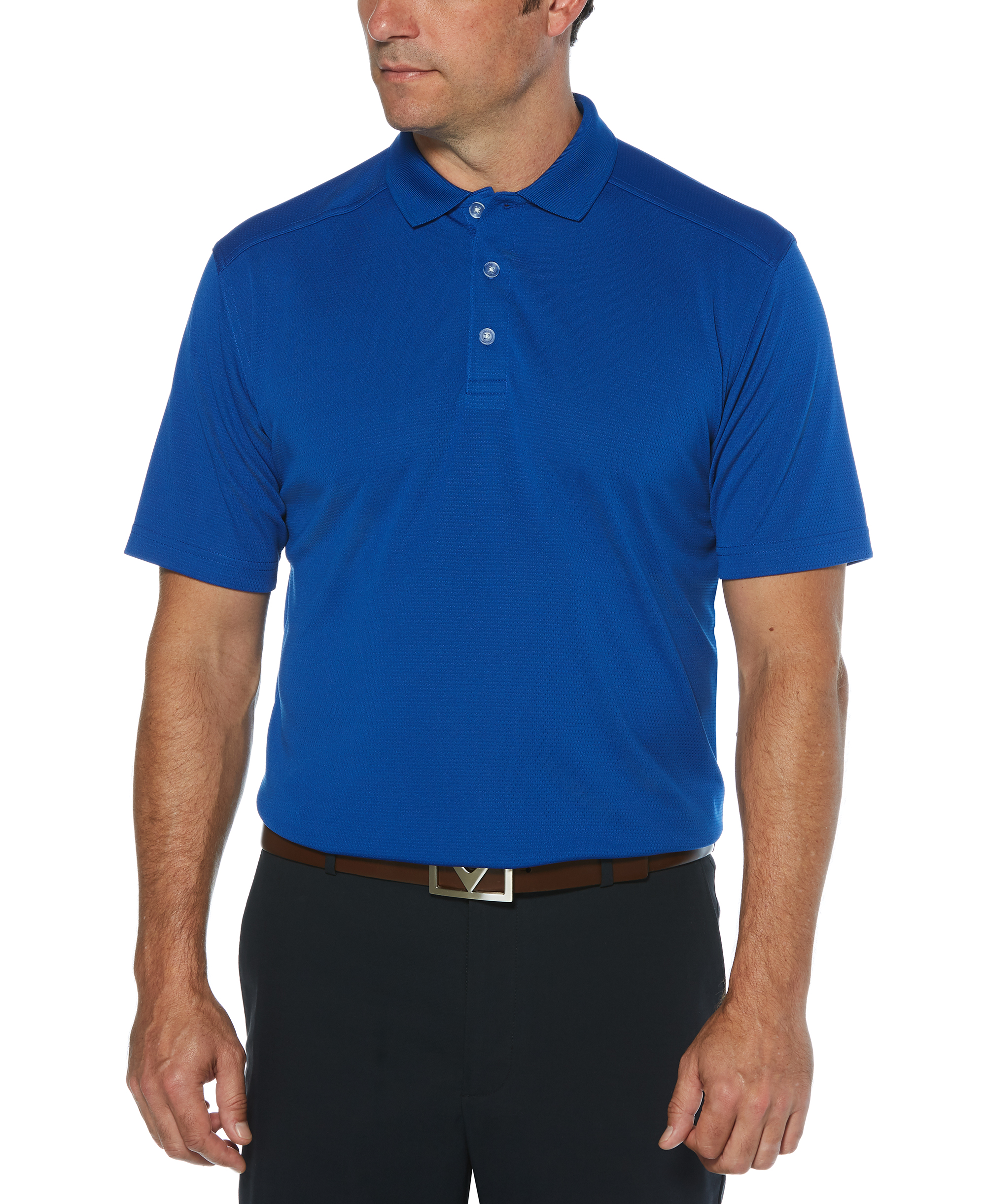5.6 oz 100% polyester double knit mesh fabric. Opti-Dri technology transfers moisture away from the body to keep you cool and dry. Rib knit collar and open sleeve. 4-button slim line placket with Callaway embossed buttons. Front darts add contour. Rounded bottom with double needle hem. Heat transfer Chevron logo on back neck.