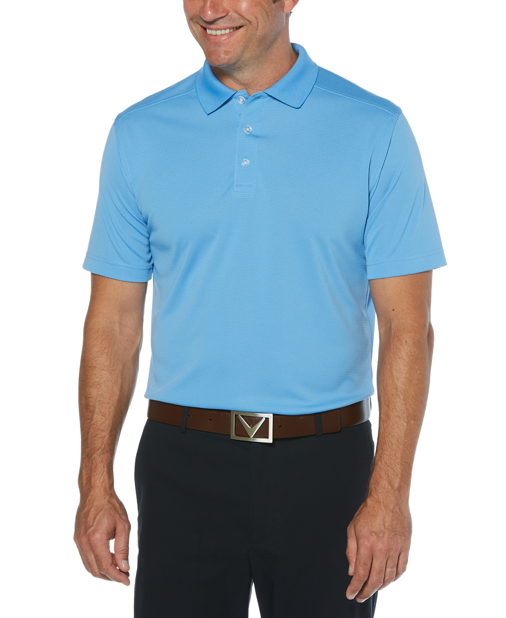 5.6 oz 100% polyester double knit mesh fabric. Opti-Dri technology transfers moisture away from the body to keep you cool and dry. Rib knit collar and open sleeve. 4-button slim line placket with Callaway embossed buttons. Front darts add contour. Rounded bottom with double needle hem. Heat transfer Chevron logo on back neck.