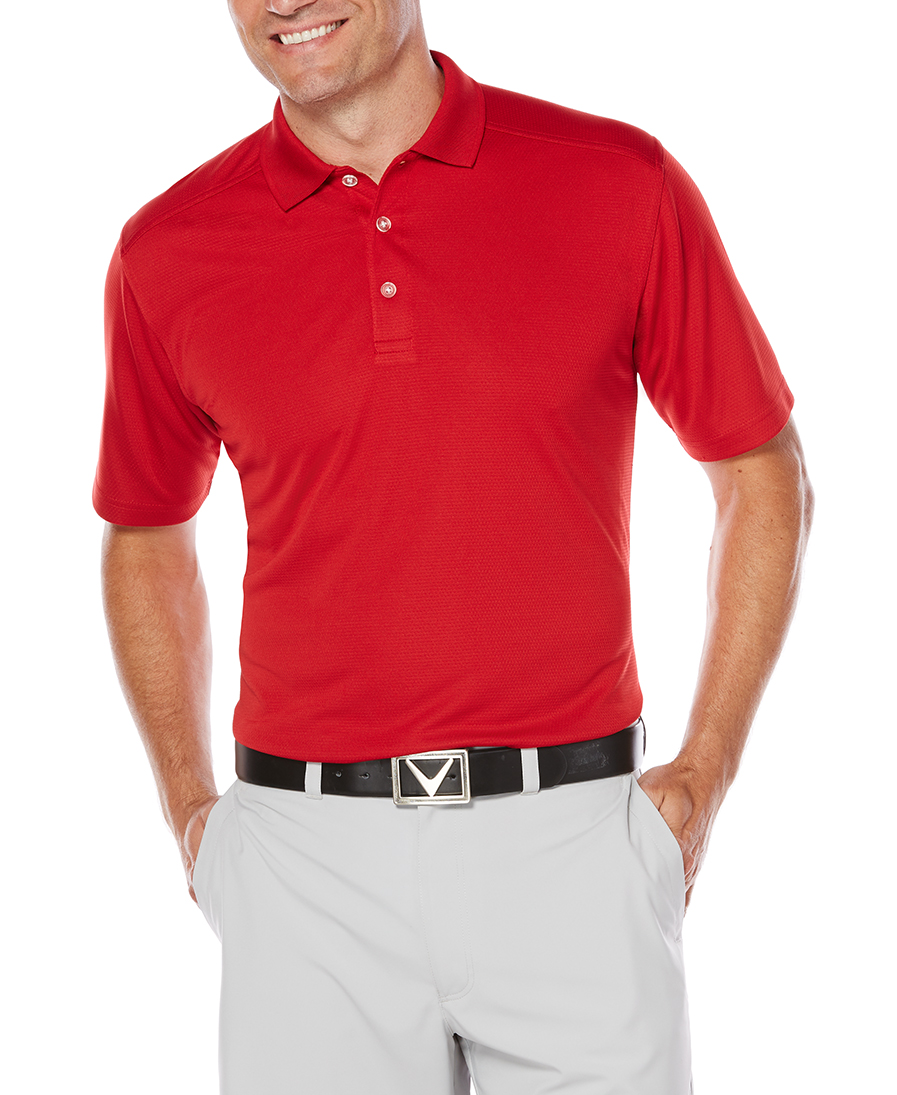 5.6 oz 100% polyester double knit mesh fabric. Opti-Dri technology transfers moisture away from the body to keep you cool and dry. Rib knit collar and open sleeve. 4-button slim line placket with Callaway embossed buttons. Front darts add contour. Rounded bottom with double needle hem. Heat transfer Chevron logo on back neck.